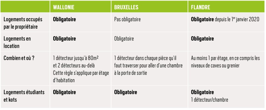 En Région wallonne, l'installation de détecteurs de fumée dans tous les logements – y compris les logements étudiants et kots - est obligatoire depuis octobre 2004.