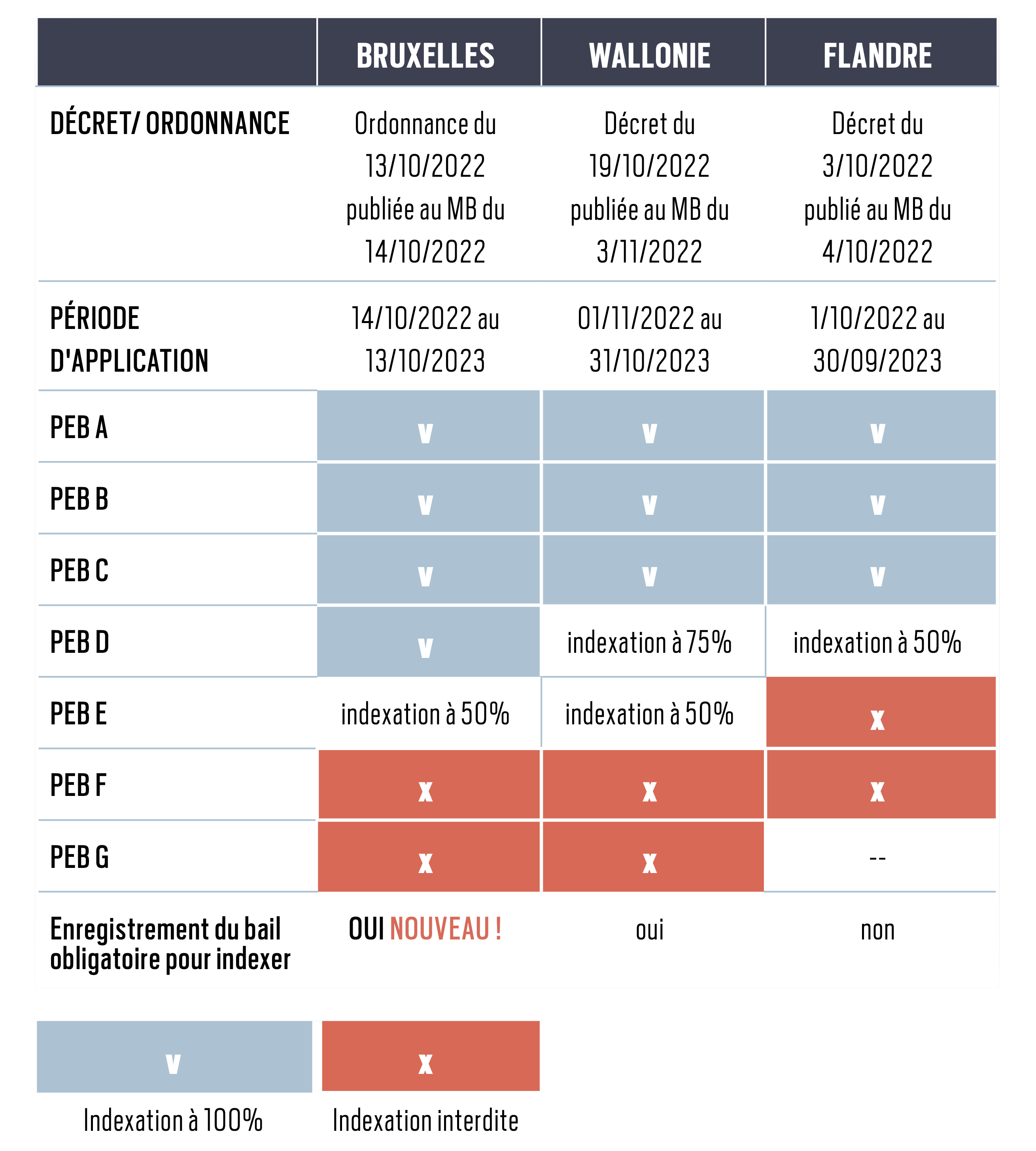 Suite à la crise énergétique, les gouvernements des 3 régions ont adopté ces derniers mois de nouveaux décret/ordonnance qui lient la possibilité ou l'interdiction d’indexer le loyer en matière de logement au PEB.