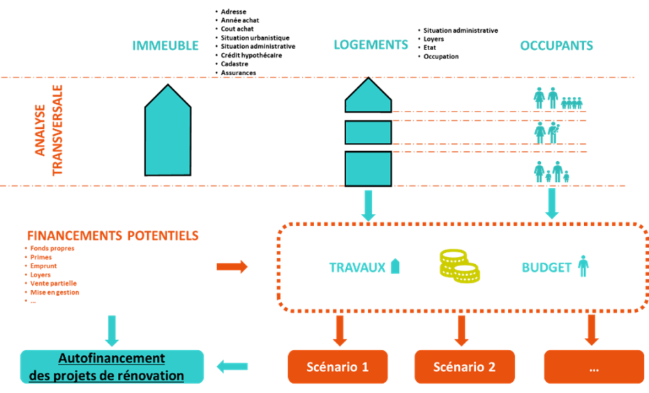 Après une première rencontre avec l’équipe, le gestionnaire technique effectue une ou plusieurs visites du bâtiment, analyse la situation urbanistique du bien et détermine quels sont les travaux à réaliser. Il propose ensuite plusieurs scénarios de travaux possibles sur base d’un plan financier sommaire. La situation énergétique du bâtiment est étudiée afin de viser une meilleure performance énergétique du logement ou du bâtiment. Lorsque le propriétaire accepte l’un des scénarios présentés, s’enclenche le suivi du ou des locataires. Le gestionnaire technique accompagne le propriétaire durant la totalité du processus : recherche d’un architecte, collaboration avec l’architecte durant la demande de permis d’urbanisme, recherche d’un entrepreneur, suivi du chantier, etc. La réflexion sur le financement des travaux est évidemment faite en concertation avec le propriétaire et les possibilités d’aides sont considérées en fonction du scénario (primes, crédit ECORENO, etc.).