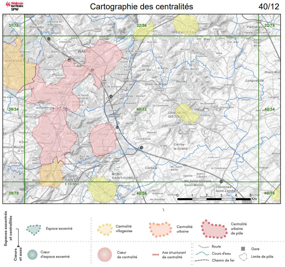 Prenons l’exemple de la cartographie de Wavre et ses alentours sur laquelle sont définis les périmètres de ces différentes centralités.