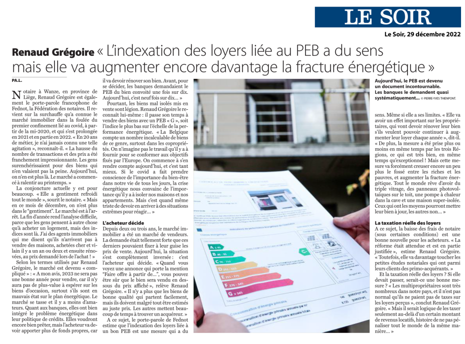Le journal "le Soir" du 29 décembre dernier nous a réservé une nouvelle sortie « de qualité », celle de l’ineffable porte-parole francophone des notaires, Maître Renaud GREGOIRE.
