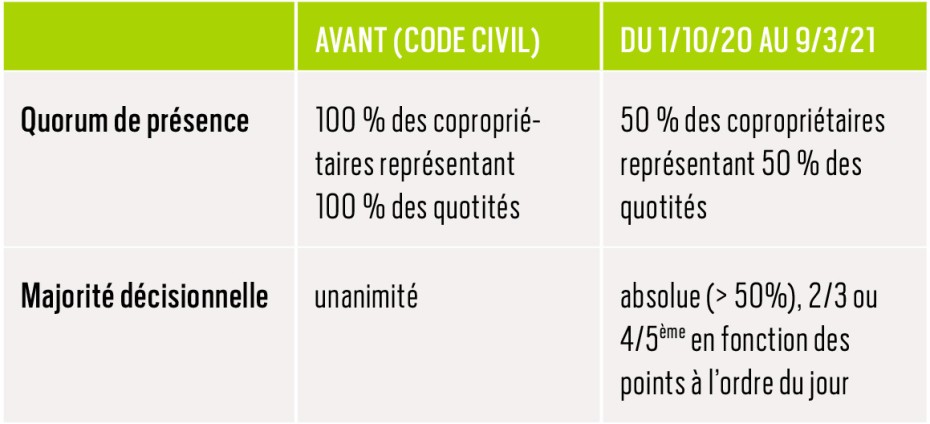 Alors que le code civil exigeait que tous les copropriétaires participent au vote et que toutes les décisions prises le soient à l'unanimité, la loi du 20 décembre assouplit temporairement ces critères en acceptant les quorums et majorités décisionnels des AG en présentiel.